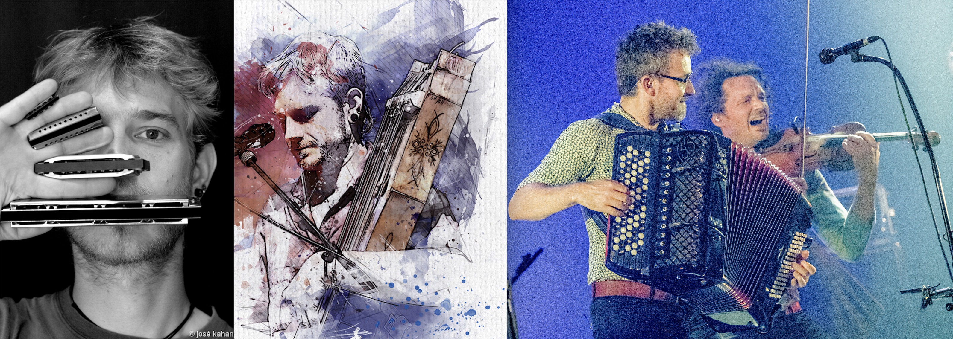 Dani Padpé: Multi-harmoniciste et pluri-percussionniste, je me prends au jeu de l’animation du bal et du concer, tant au milieu des danseurs que sur scène. Ma particularité, le goût du risque. J'apprécie l’imprévu, voire l’inconnu. Avec une formule simplifiée (harmonicas, percussions & chant), je touche et invite à la danse, jusqu’à peut-être… nous porter vers la transe.